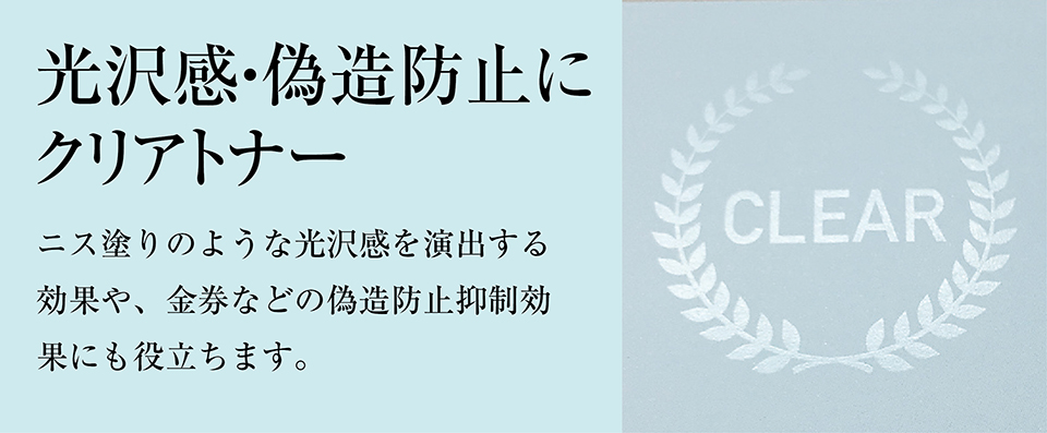 CMYKトナーの下にスペシャルカラーを刷ることが可能です。ゴールドやシルバーを下刷りし、CMYKと混色することで光輝性の高いメタリックカラーを実現することができます。